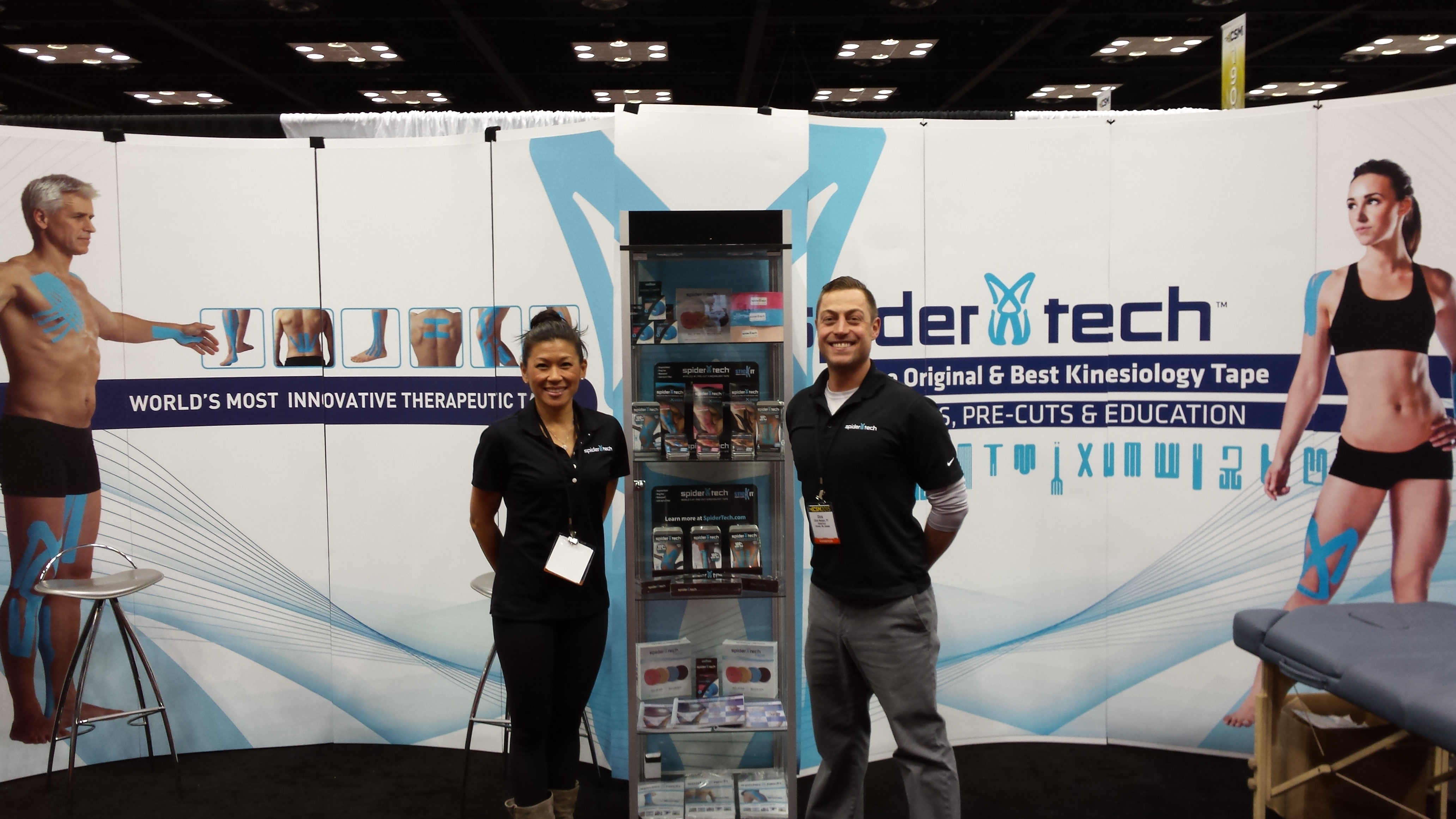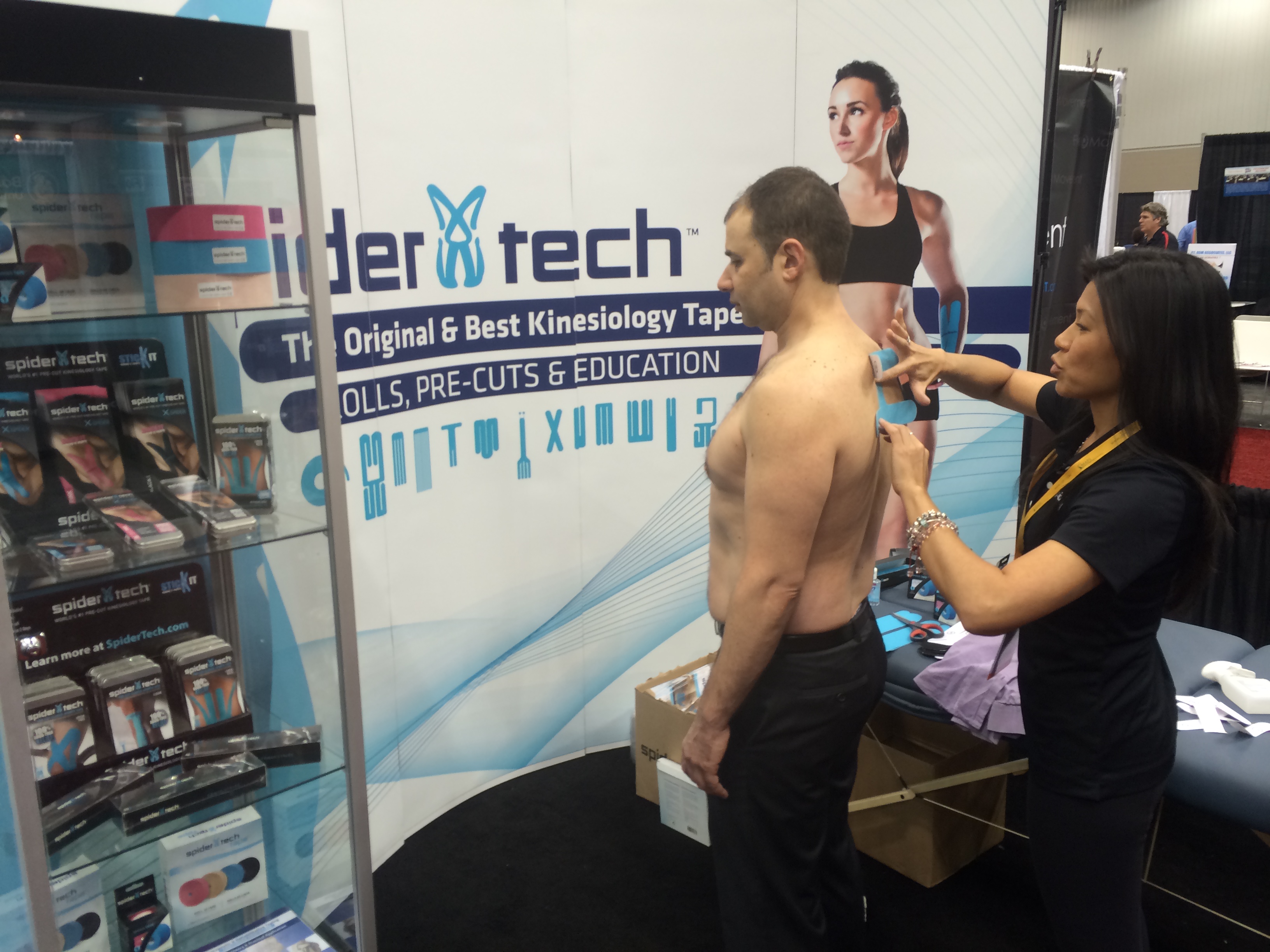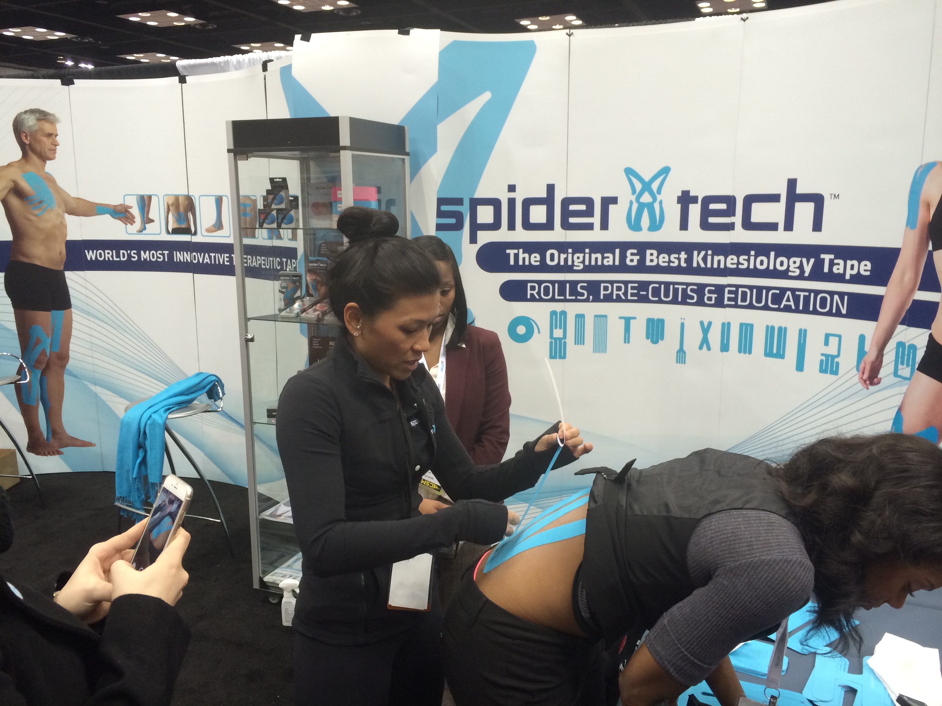 Karena, along with Alex Reid and Chris Nentarz of SpiderTech, manned the booth, delivering detailed information and demonstrating proper taping techniques.